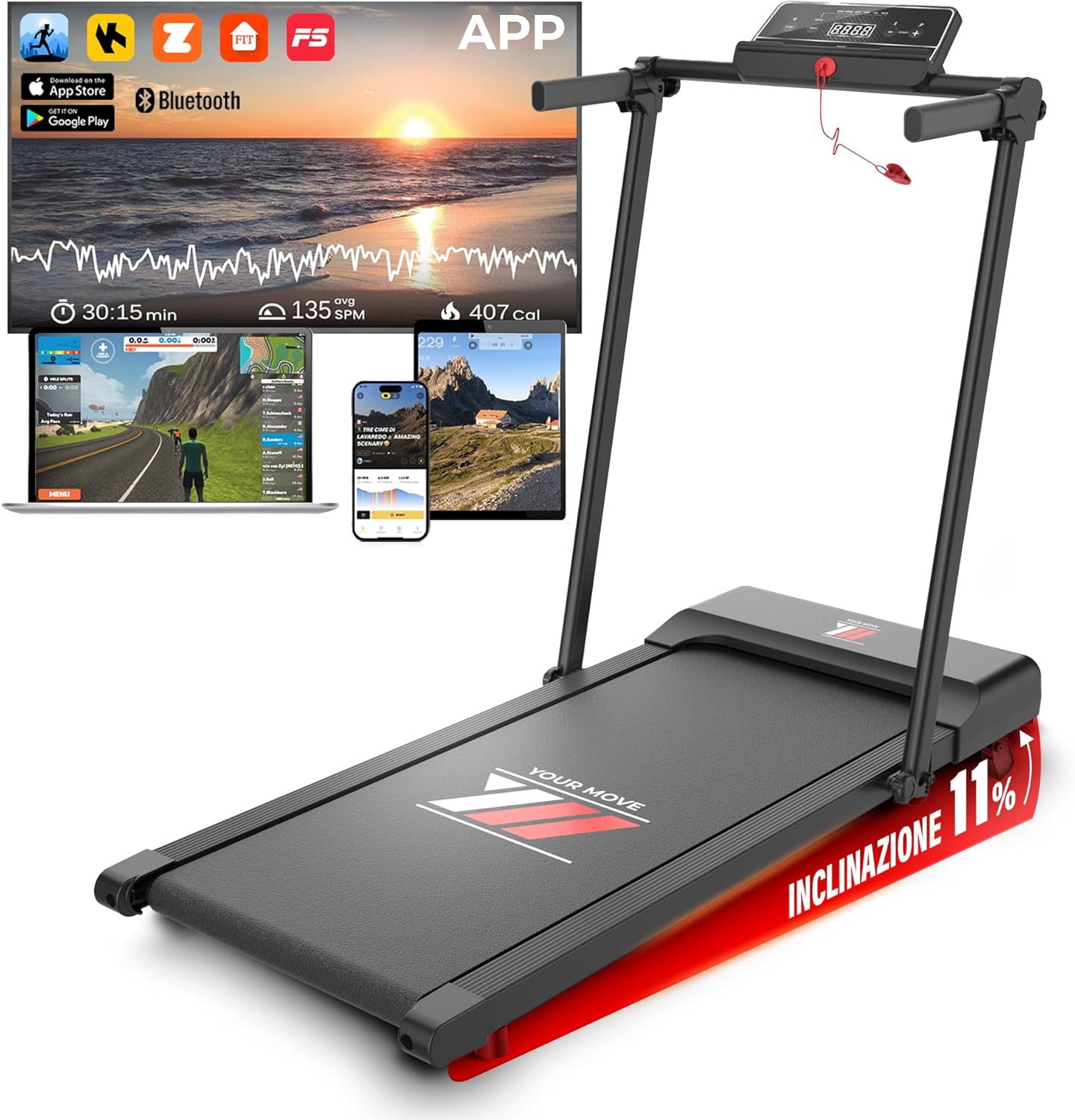 Scopri YM Tapis Roulant Salvaspazio Elettrico NEXT 1000 Your Move: allenati fino a 12 km/h con maxi superficie da 42 cm, inclinazione e programmi guidati in un design pieghevole con assistenza italiana